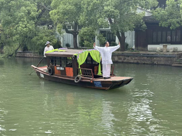 ▲姜纯民老师正在金泽古镇特色游览乌篷船上演示“船拳”。