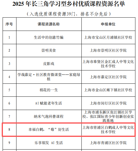 近日,2025年长三角学习型乡村优质课程资源与建设品牌项目遴选结果正式公布,我校报送的课程《幸福白鹤,“莓”好生活》成功入选优质课程资源名单,这是我校在推进乡村社区教育、助力长三角一体化发展中的重要成果。