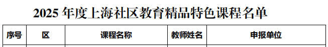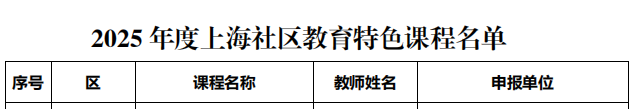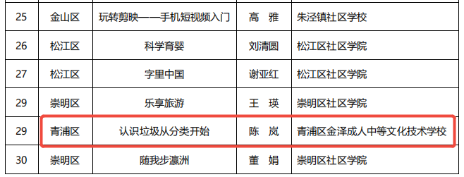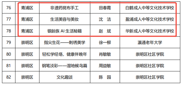 上海市学习型社会建设服务指导中心办公室、上海开放大学社区教育部在全市社区教育系统组织开展2025年度上海社区教育特色课程征集与遴选活动,青浦区共4门课程申报并入选,其中金泽成校陈岚老师《认识垃圾从分类开始》课程入选2025年度上海社区教育精品特色课程,白鹤成校田春霞老师《非遗药斑布手工》、盈浦成校沈洁老师《生活美容与美妆》、华新成校赵斌老师《银龄族AI生活秘籍》等3门课程入选2025年度上海社区教育特色课程。