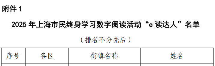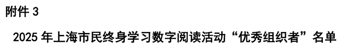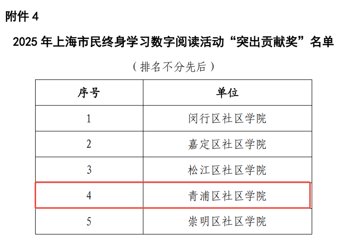 在2025年青浦市民终身学习数字阅读活动中,顾雪奎等同志评为“e读达人”、蒋齐华等团队评为“e读先锋小组”、区社区学院索乃颖老师评为“优秀组织者”,青浦区社区学院由于在整个“十四五”期间的优秀组织工作,获评“突出贡献奖”。