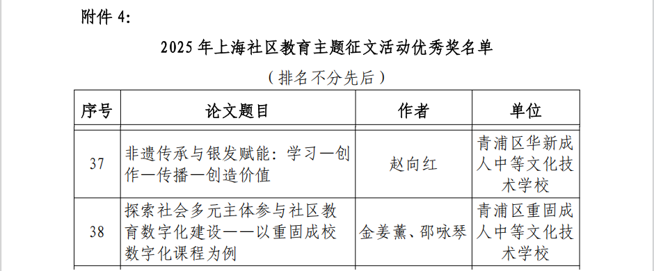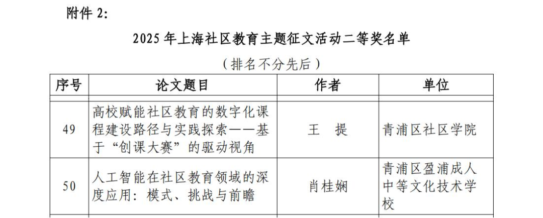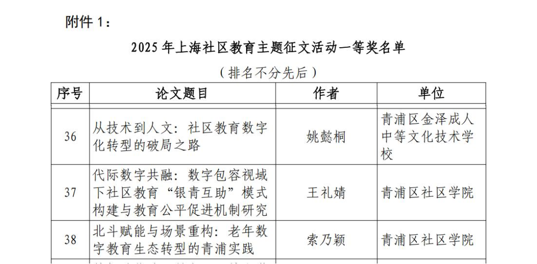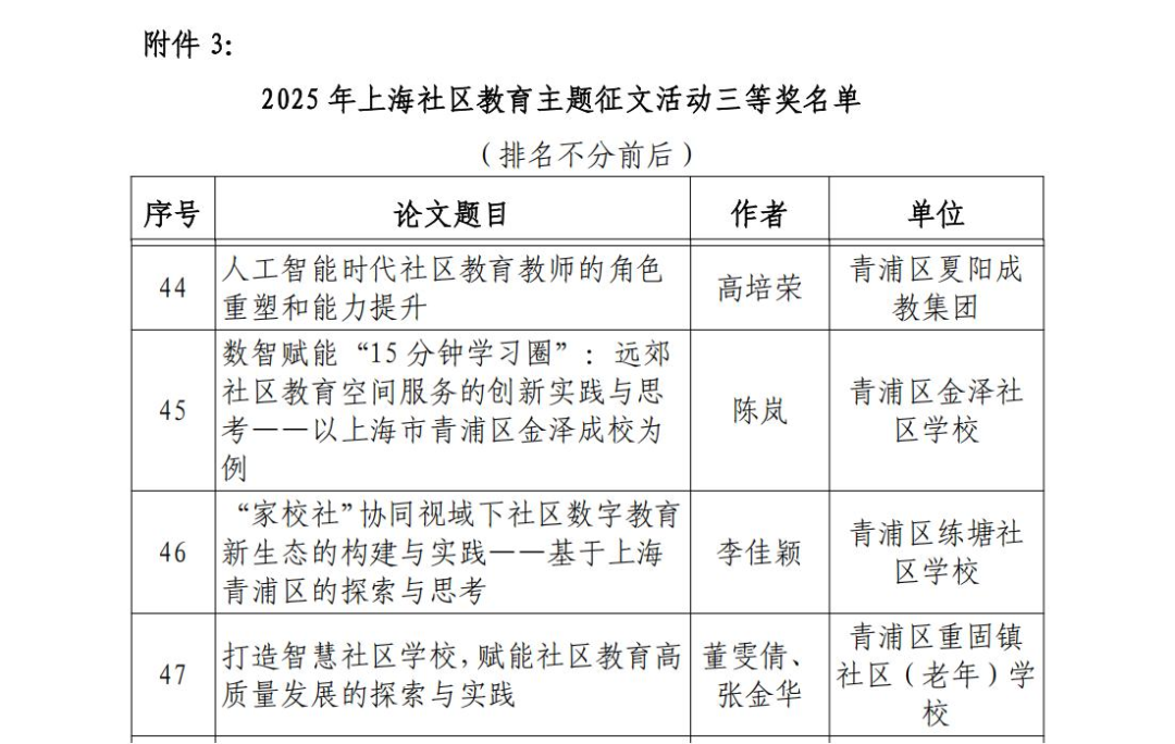在上海市学习型社会建设服务指导中心办公室联合上海市成人教育协会推进学习化社区工作委员会、上海市终身教育研究会社区教育专业委员会共同组织开展的“数智赋能社区教育高质量发展”2025年上海社区教育主题征文活动中,青浦区积极组织并参与征稿工作,共选送论文11篇并全部获奖,其中一等奖3篇、二等奖2篇、三等奖4篇、优秀奖2篇。
