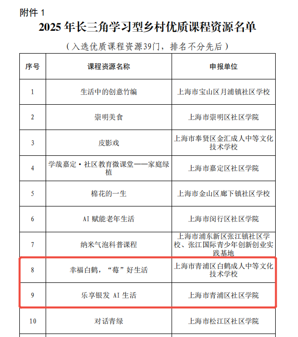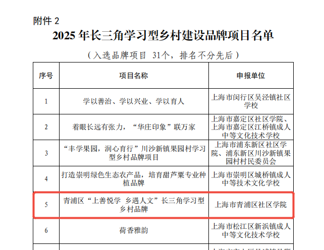 2025年上海市学习型乡村建设工作中,青浦区社区学院打造“上善悦学·乡遇人文”品牌,依托区域资源,探索学习型乡村路径,通过构建学习点网络、融合“学习 文旅 治理”,提升村民学习意识,扩大乡村文化影响,增强治理效能,推动城乡融合和乡村文化振兴。项目入选2025年长三角学习型乡村建设品牌项目。此外,青浦区社区学院《乐享银发·AI生活》和香花桥成教集团白鹤成校《幸福白鹤,“莓”好生活》课程资源也入选2025年长三角学习型乡村优质课程资源。