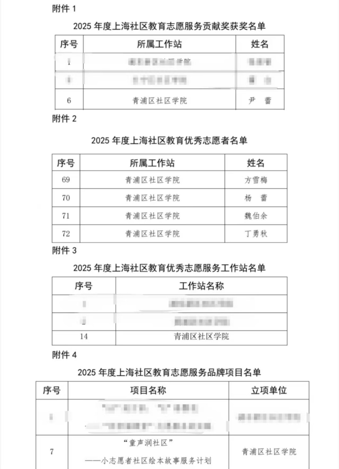 在2025年度上海社区教育志愿服务评优活动中,赵巷成教集团徐泾成校尹蕾荣获“志愿服务贡献奖”,夏阳成教集团盈浦成校魏伯余、香花桥成教集团白鹤成校方雪梅、重固成教集团华新成校杨蕾、朱家角成教集团朱家角成校丁勇秋荣获“优秀志愿者”,青浦区社区学院荣获“优秀志愿服务工作站”,香花桥成教集团香花桥成校的“‘童声润社区’——小志愿者社区绘本故事服务计划“项目获评市级“志愿服务品牌项目”。