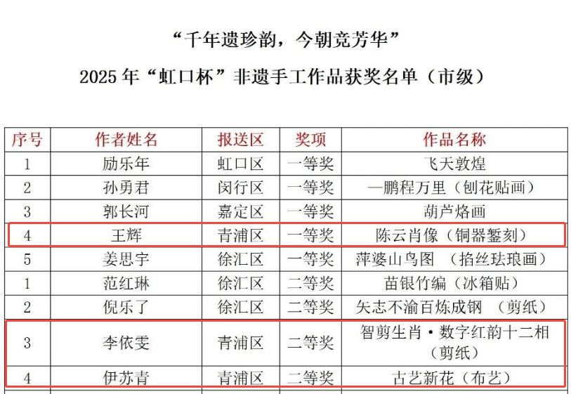 “千年遗珍韵,今朝竞芳华”2025年“虹口杯”非遗手工作品获奖名单