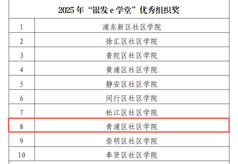 上海市学习型社会建设服务指导中心办公室、上海开放大学社区教育部组织开展2025年“银发e学堂”组织奖评选工作。青浦区社区学院获评“优秀组织奖”。75位市民入选市级“银发体验官”称号。